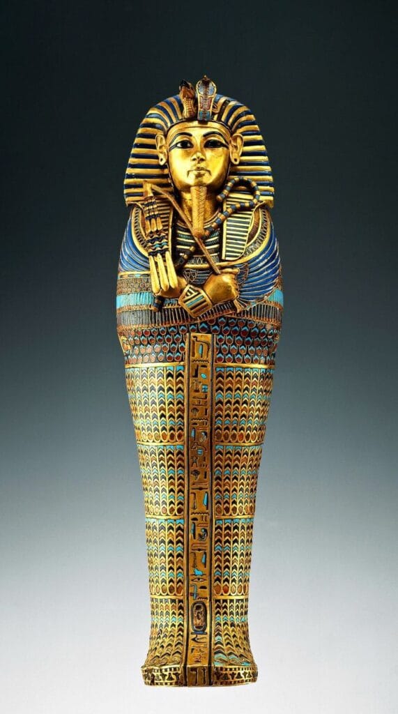 Displayed nearby are all 413 shabti figures, crafted to serve the king in the afterlife, alongside the alabaster Canopic Shrine guarded by the goddesses Isis, Nephthys, Selket, and Neith — a masterpiece of ritual protection and symbolism.